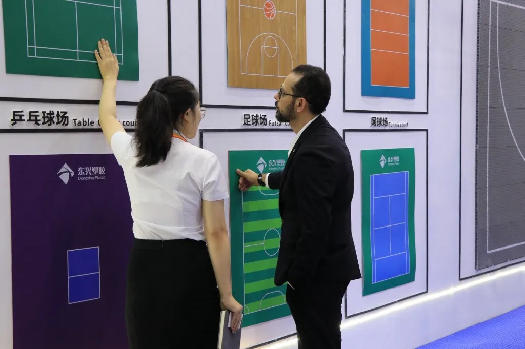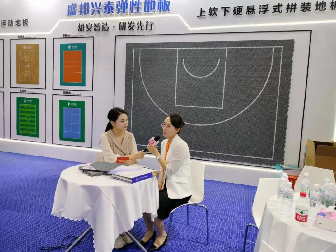 河北盛邦兴泰新材料有限公司在此次展览中获得广大消费者的青昧,脱颖而出,携全球首创双色拼装系列运动地板首次亮相其中,以优质的产品和专业的生产和施工经验,本着雄安智造,研发先行的宗旨,在行业中崭露头角。新推出的室内羽毛球场地、室内乒乓球场地、篮球场地、网球场地、排球场地、室外篮球场地等受到了新老客户的一致好评。时尚的外观设计,完美的健身功能,优越的运动性能深受各界领导与新老客户的喜爱。